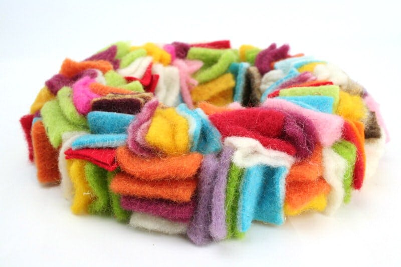 Probieren Sie es einfach mal aus. Es ist ganz leicht. Aus Wollvlies haben wir kleine Quadrate geschnitten (ca. 4 cm), falten diese einmal in der Mitte und kleben den Rücken mit der Heißklebepistole auf den Kranz, den wir als Unterlage gewählt haben. Hierfür eignet sich z.B. ein sog. Strohrömer gut.