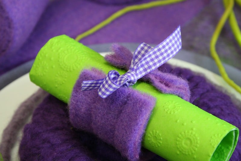 Ein hübscher Serviettenring darf dabei natürlich auch nicht fehlen. Wir empfehlen Serviettenringe aus Wollvlies. Probieren Sie doch mal die Wirkung von Komplementärfarben aus, also wie auf unserem Foto: hellgrüne Serviette und lila Serviettenring.