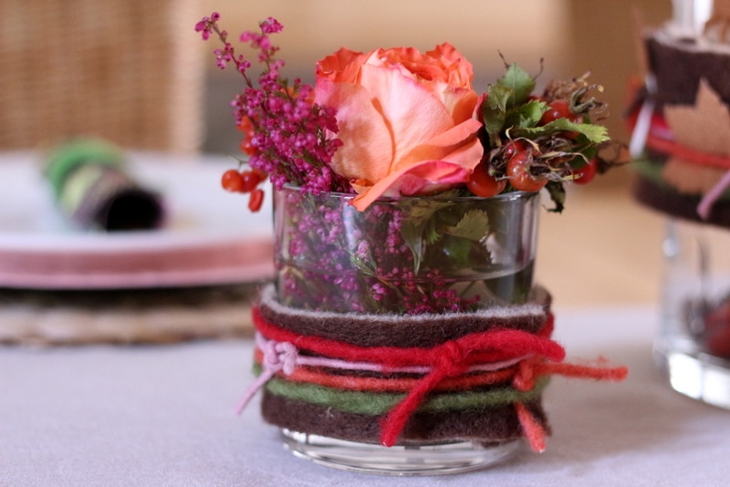 Passend zum großen Kerzenglas dekorieren wir noch zwei kleinere Gläser. Während wir außen herum unsere Wollprodukte verwenden, füllen wir das Glas mit echten, frischen Blumen. Eine Rose, ein Hagebuttenzweig, ein paar Vogelbeeren und einen Erika-Zweig in frisches Wasser gestellt – fertig ist die Tischdeko, die sich übrigens auch prima für die Theke in der Arztpraxis und den Schreibtisch eignet.