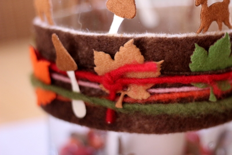 Heute haben wir ein Kerzenglas in warmen Erdtönen dekoriert. Dazu haben wir zweifarbiges braunes Wollvlies genommen und mit Wolllunte und ausgestanzten Accessoires umwickelt.