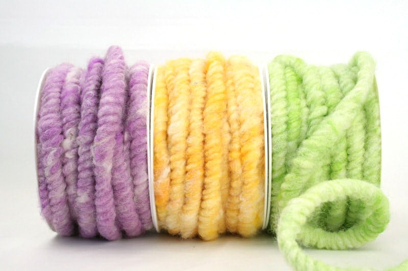 Zartes flieder, frisches gelb und ein luftig helles grün sehen Sie auf dem Foto. Die neuen Filzkordeln sind melliert, dass heißt, die Farben sind mit cremefarbener Wolle durchzogen. Das gibt eine besonders schöne, frische Optik.