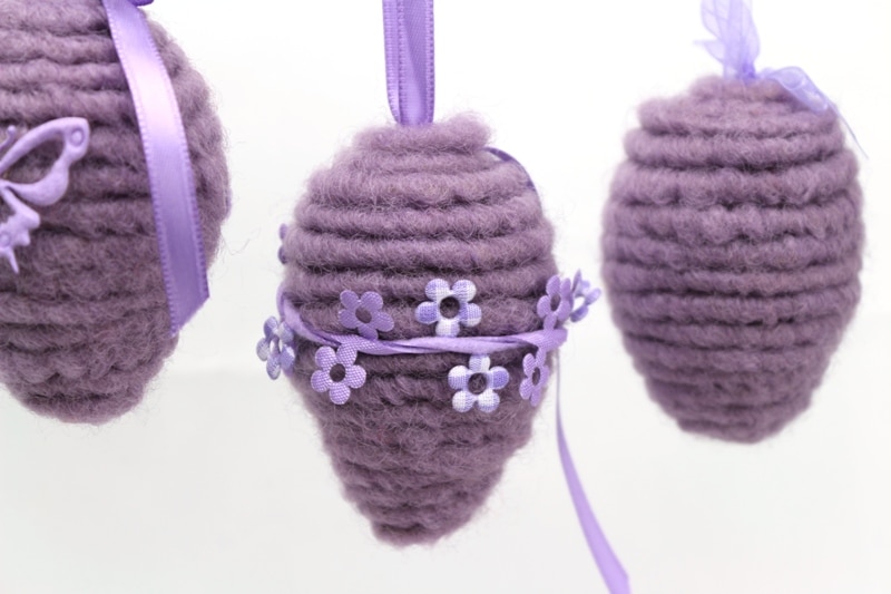 Als Grundlage können Sie ausgeblasene Eier oder Kunststoffeier verwenden. Kleben Sie doppelseitiges Klebeband darum. Und nun wird der Wolldocht langsam von oben nach unten darum gewickelt. Schließlich können Sie Ihr Werk noch mit Accessoires und Bändern schmücken.